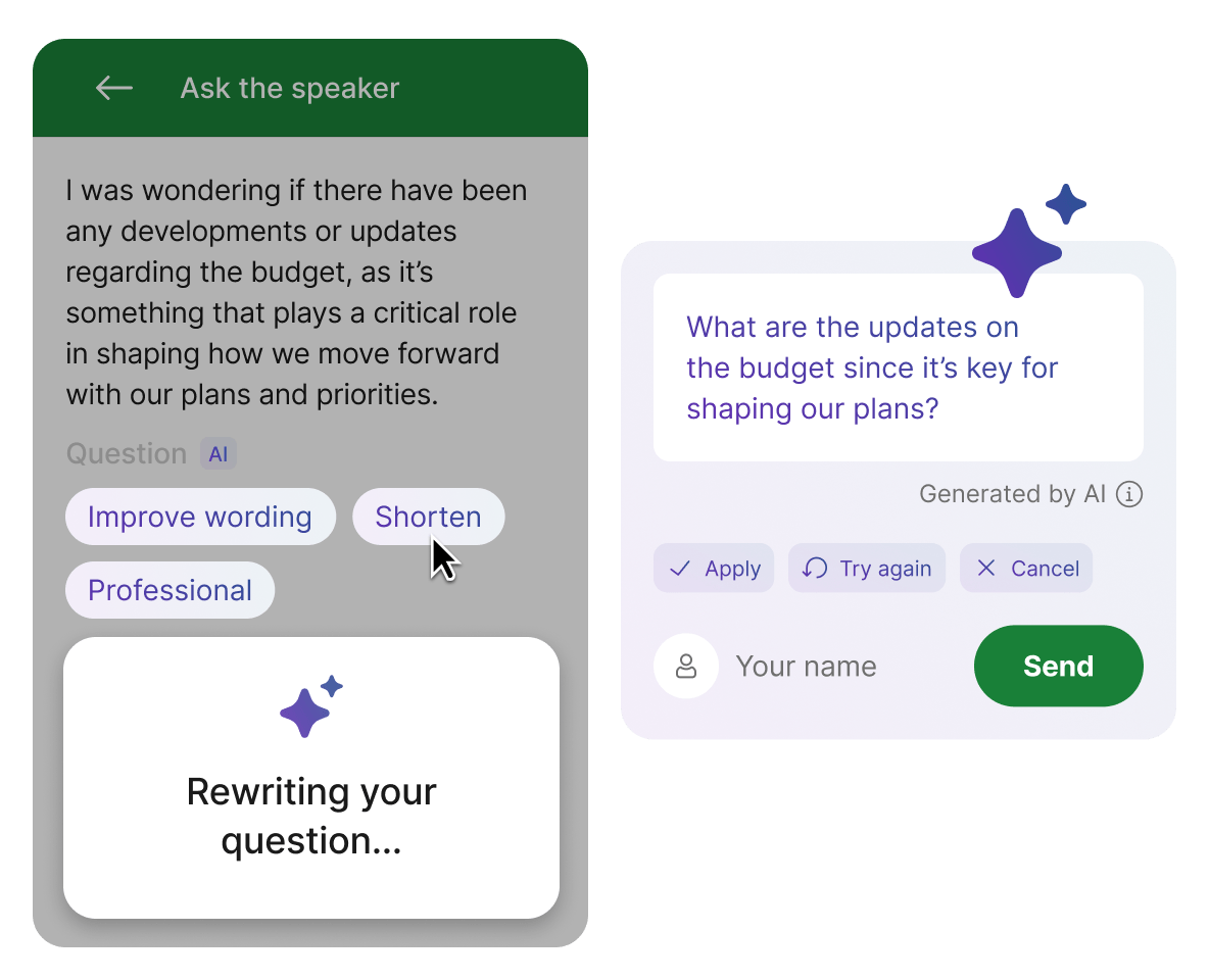 Help participants ask clearer questions with more confidence. AI helps them improve wording, shorten, longer questions and adjust tone before sending.