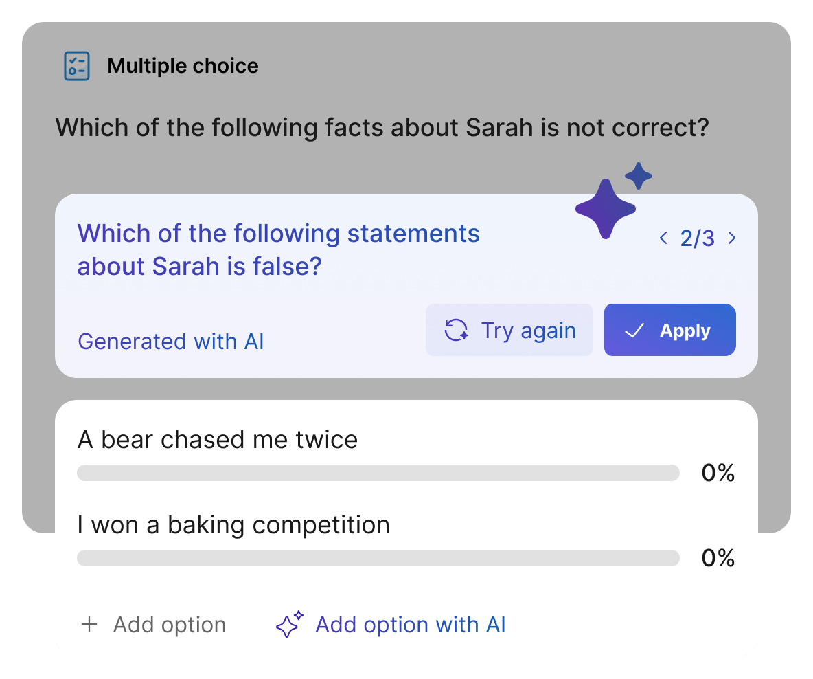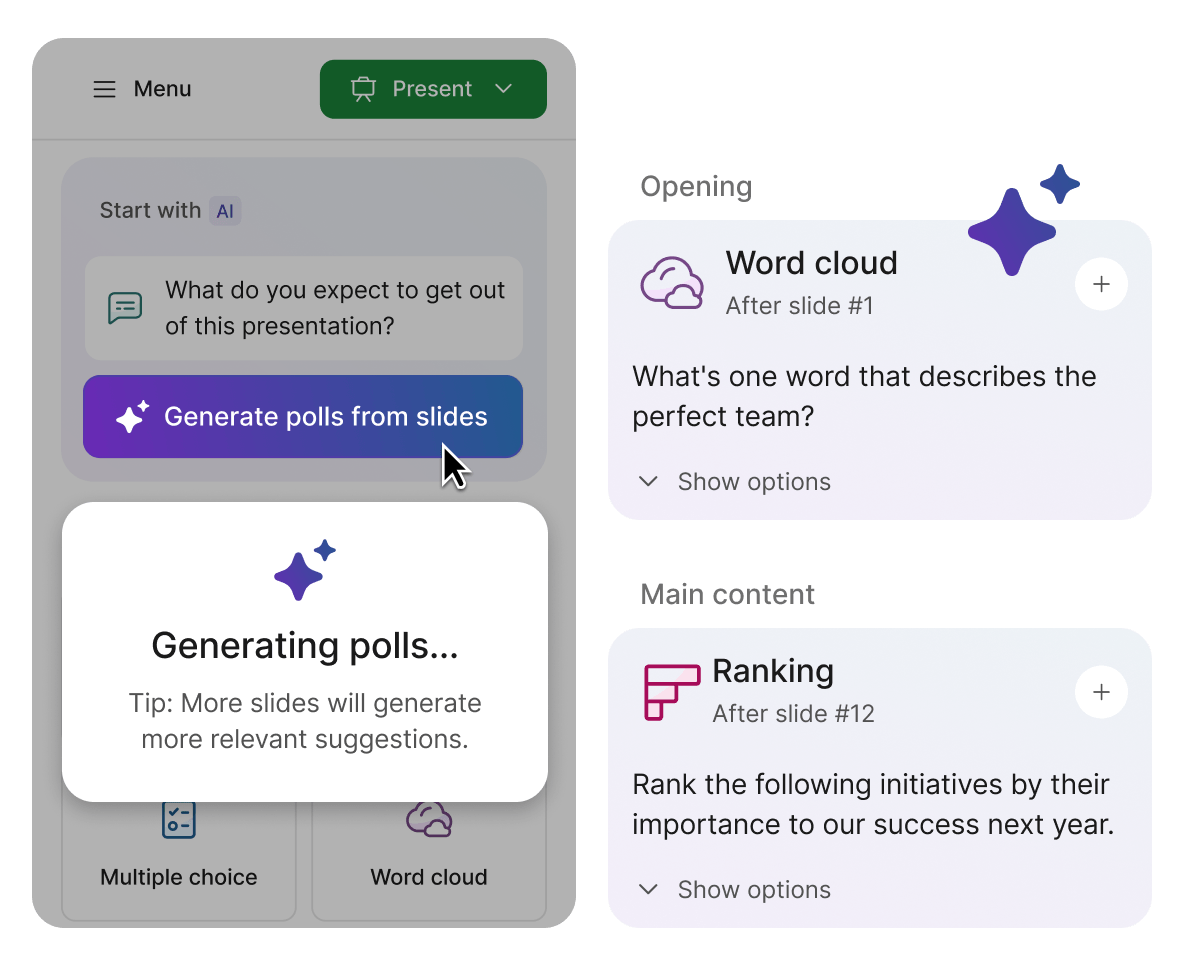 Fine-tune your poll questions without spending extra time on wording. Let AI rephrase questions for clarity and come up with answer options for multiple choice and ranking polls.